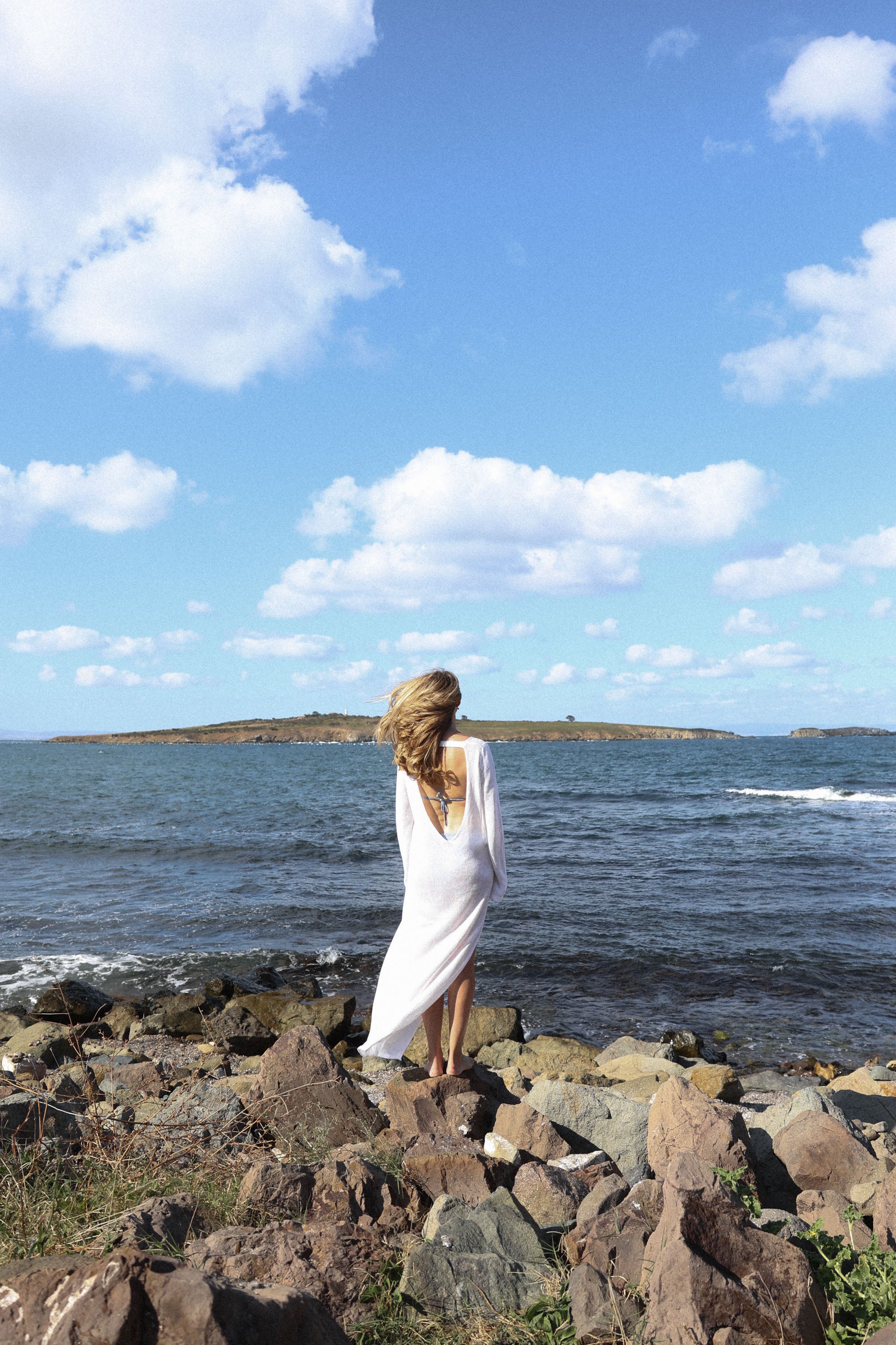 Ar basomis per smėlį, ar keliaudama į vakarienę prie jūros – ši paplūdimio suknelė kalba šiuolaikinės sirenos balsu. Gili atvira nugara kursto paslaptį, aukštas skeltukas suteikia judesiui laisvės, o natūralus linas apgaubia saulės nubučiuotą kūną. Leisk, kad jūros vėjas taptų tavo kvepalais, o linas – antra oda.