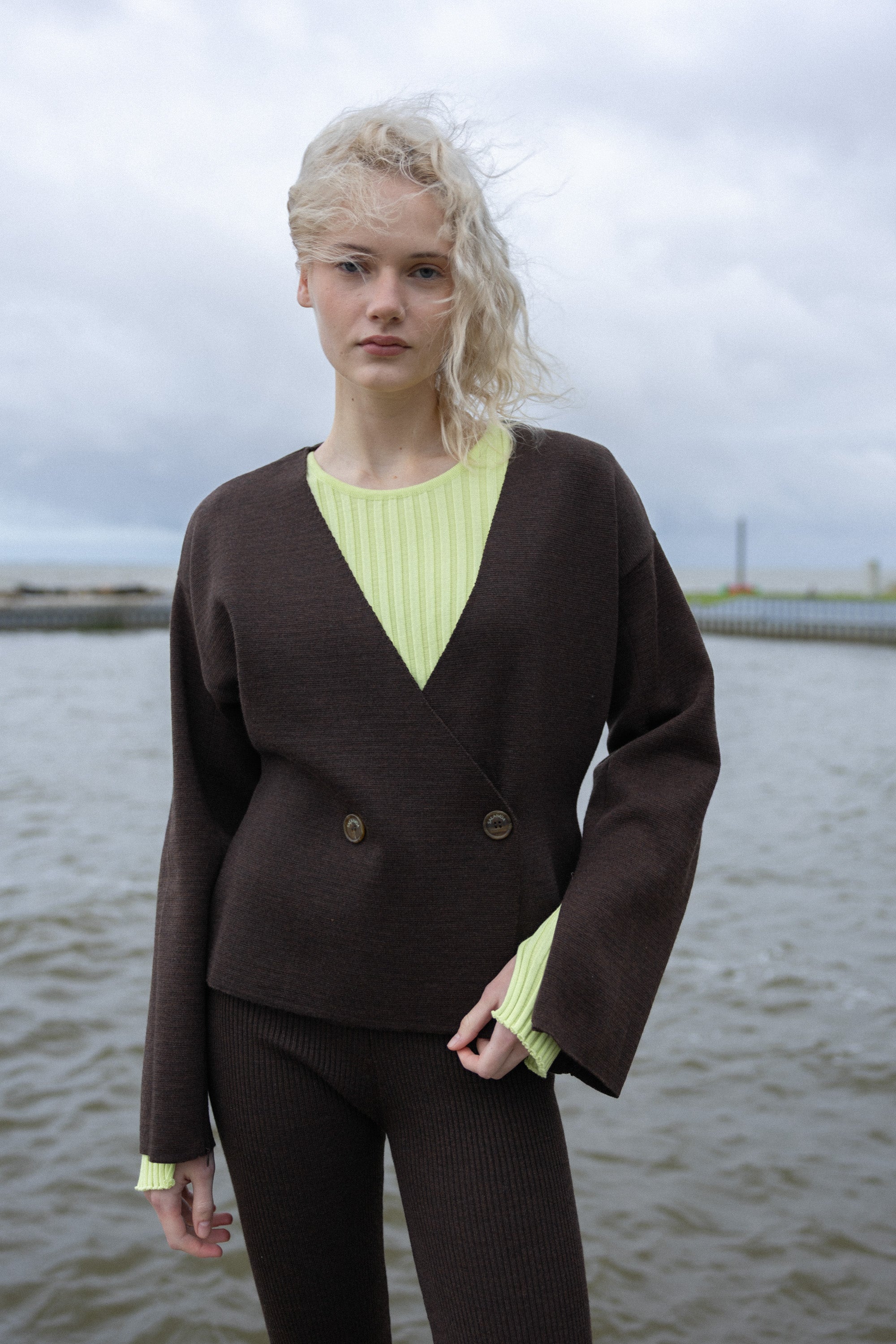 Grožis slypi paprastume - Brera merino palaidinė yra bazinė kiekvienos spintos sudedamoji dalis. Tampraus stulpelių rašto ji sukurta prigludusio silueto su prailgintomis rankovėmis, kurios užbaigtos skeltuku.