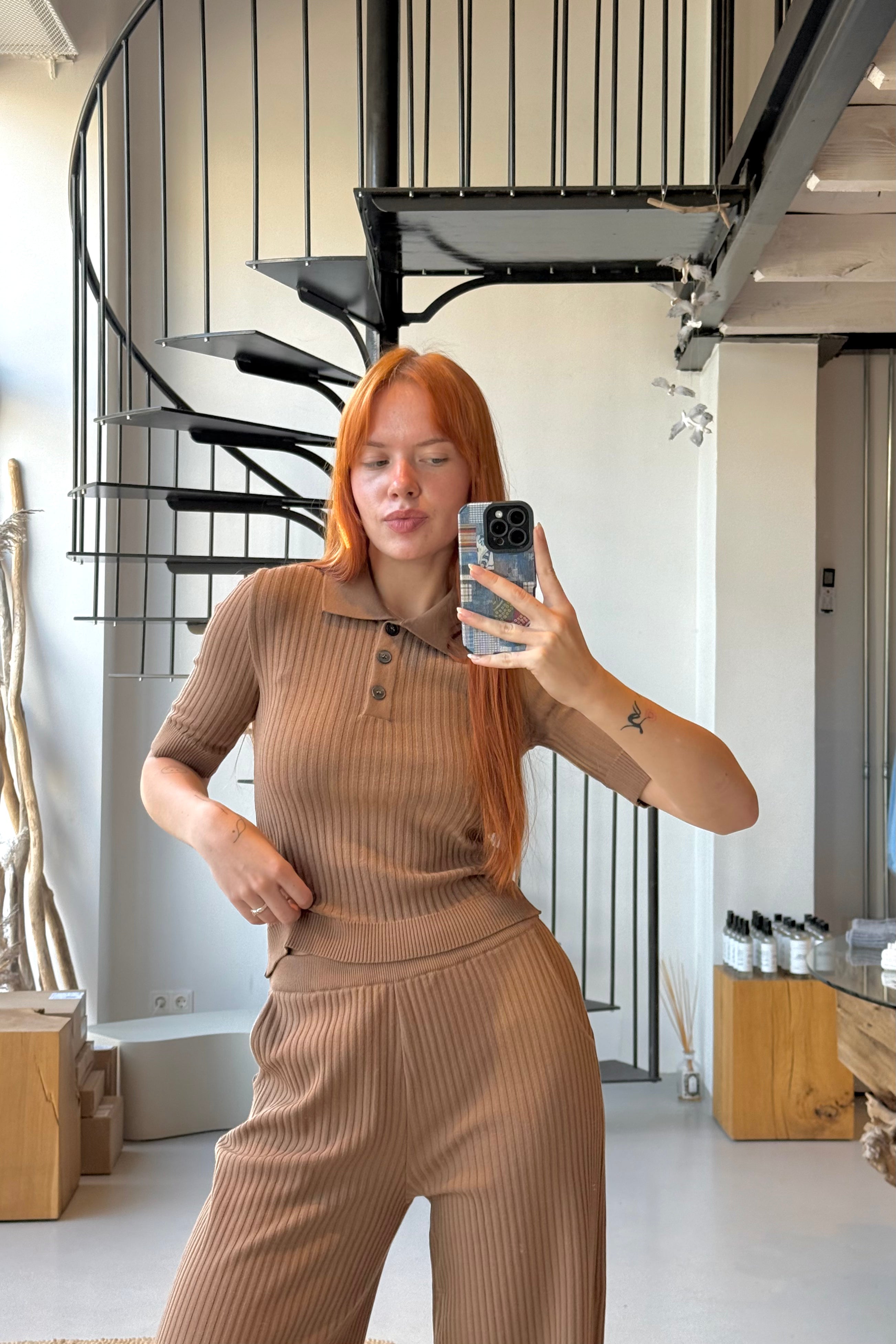 Subtili elegancija ir kasdienis lengvumas. Madonna polo palaidinė megzta standžiu stulpeliu, sukurta trumpomis rankovėmis ir dailia polo apykakle su sagutėmis.